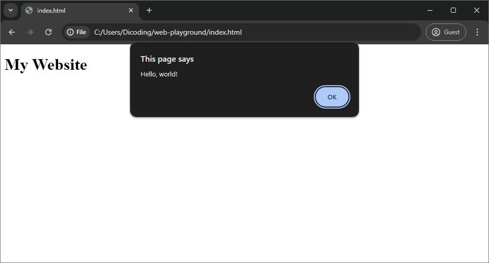 Berkas di atas adalah index.html yang dibutuhkan untuk menampilkan konten dan struktur halaman web. Jika dilihat, ada program JavaScript di dalamnya yang dibungkus oleh elemen <script>. Jika dijalankan, hasilnya akan seperti berikut.